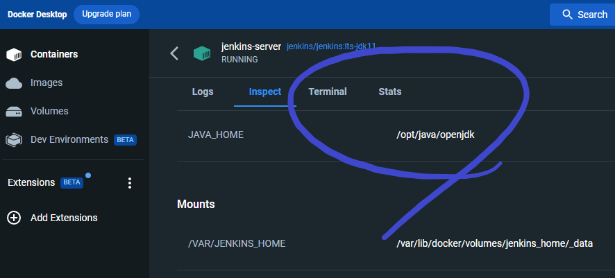 도커 데스크탑으로 돌아가서 Ispect 클릭하면 자바 경로가 나옵니다😀
