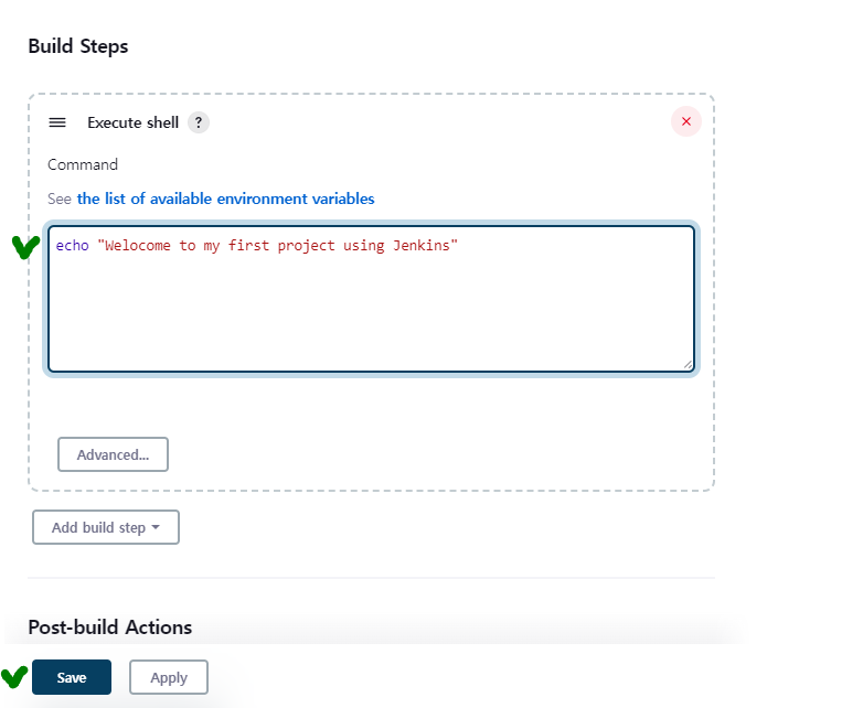 Execute shell : 실행했을 때 실행 멘트