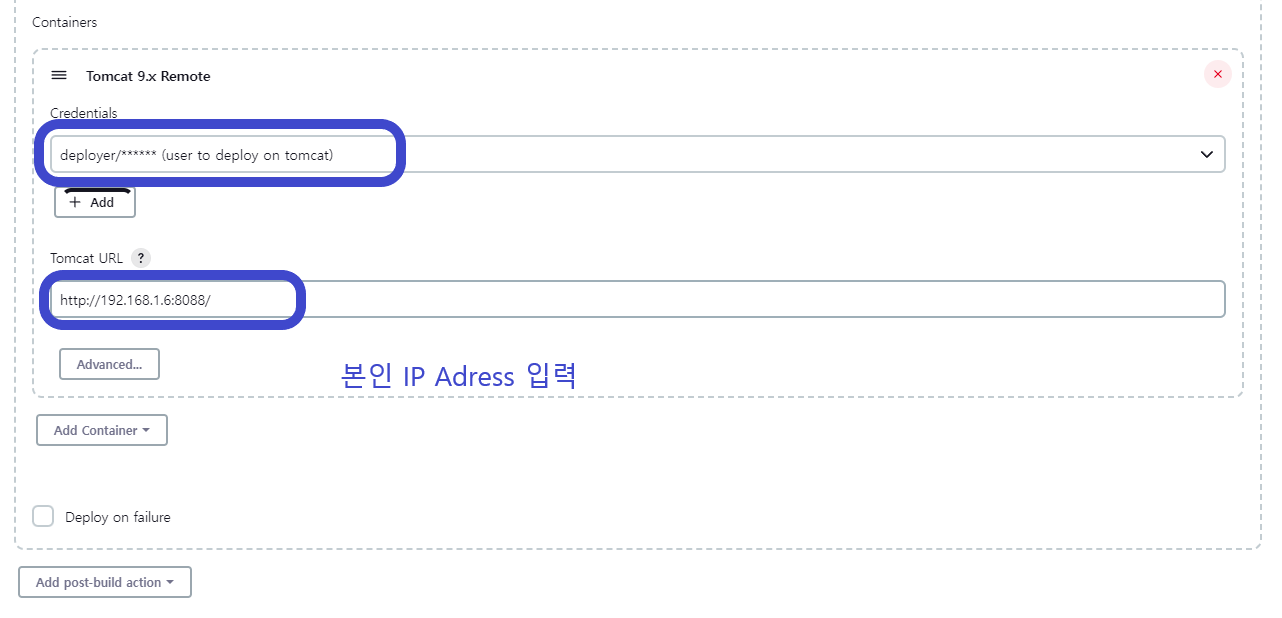 localhost 말고 꼭 ip address(이유: 젠킨스->톰켓이 아니라 젠킨스->젠킨스가 되버림)