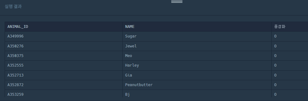 SEX_UPON_INTAKE LIKE '%Spayed%', 'O', 'X') AS 중성화