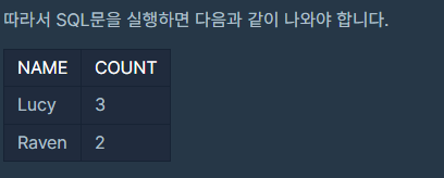 문제 동물 보호소에 들어온 동물 이름 중 두 번 이상 쓰인 이름과 해당 이름이 쓰인 횟수를 조회하는 SQL문을 작성해주세요. 이때 결과는 이름이 없는 동물은 집계에서 제외하며, 결과는 이름 순으로 조회 1. 2번 이상 쓰인 이름과 이름이 쓰인 횟수 조회 2. 이름이 없는 동물은 집계에서 제외 3. 결과는 이름 순으로 정렬 내 코드 SELECT NAME, COUNT(NAME) AS COUNT FROM ANIMAL_INS GROUP BY NAME HAVING COUNT(NAME) > 1 ORDER BY NAME; 1. Count함수로 name의 횟수를 조회 2. Group by절에 having으로 2회 이상 쓰인 name을 조회 3. Order by절로 name을 오름차순 정렬 결과 끝!